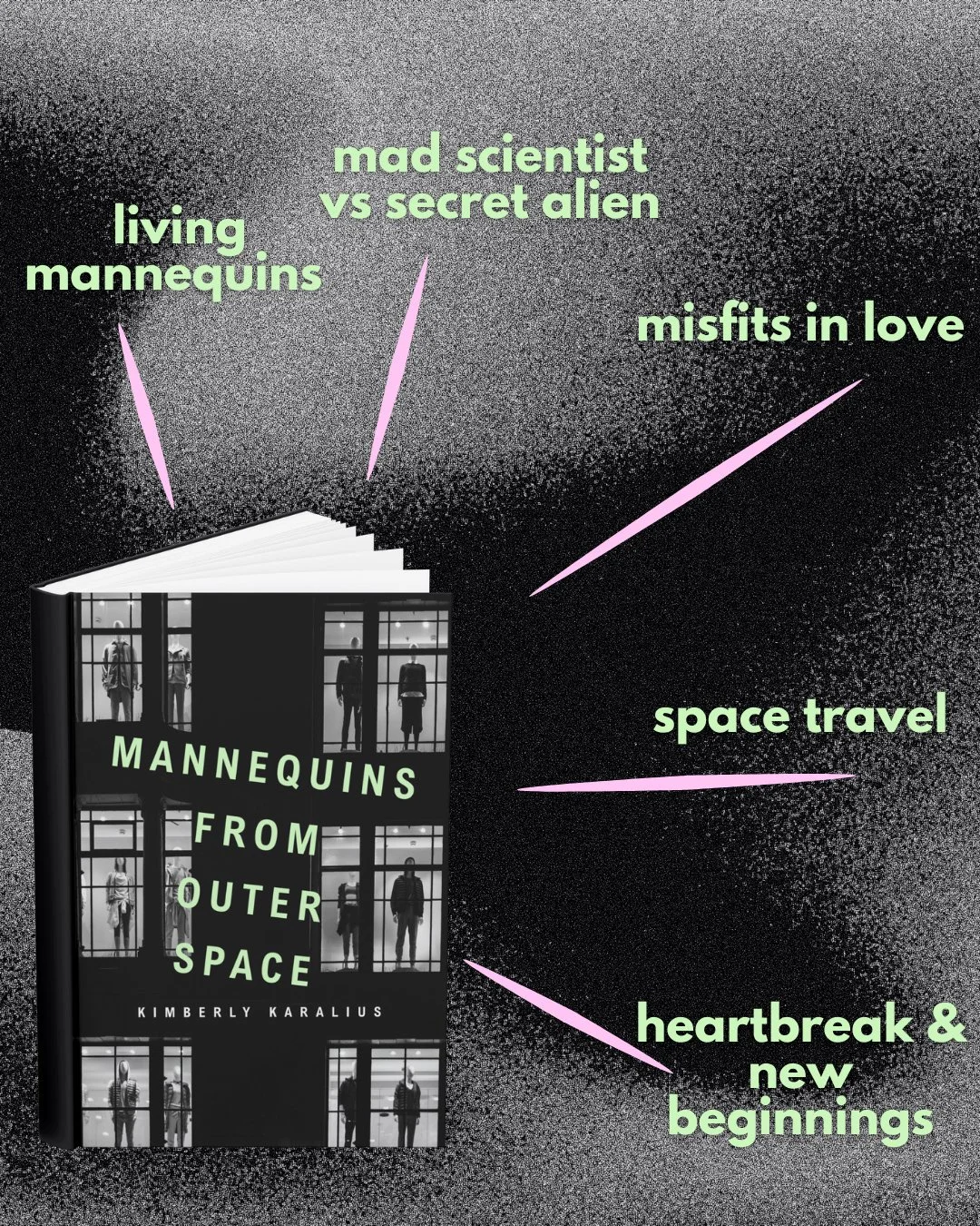 Mannequins from Outer Space contains interconnected flash fiction pieces set in a small town secretly inhabited by sentient mannequins. Maëlys, a misfit mannequin, yearns for a purpose beyond modeling for humans. Falling for the charming salon mannequin next door seems like the answer at first, but when heartbreak follows, she learns that a better life may be waiting for her beyond the stars.